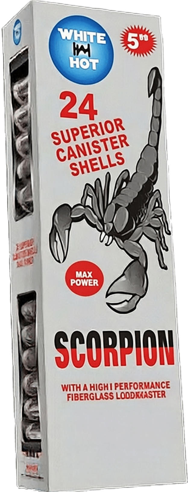 Sting the sky with deadly precision using Scorpion 5″ Canisters by White Hot Fireworks—the powerhouse 5-inch canister shell kit delivering 24 unique maximum-load 60-gram shells for massive, loud performance! This premium reloadable artillery collection unleashes enormous hard-breaking bursts, thunderous reports, and amazing vibrant effects. Includes 4 durable HDPE tubes for safe launches. Ideal for epic backyard displays and high-impact consumer fireworks.